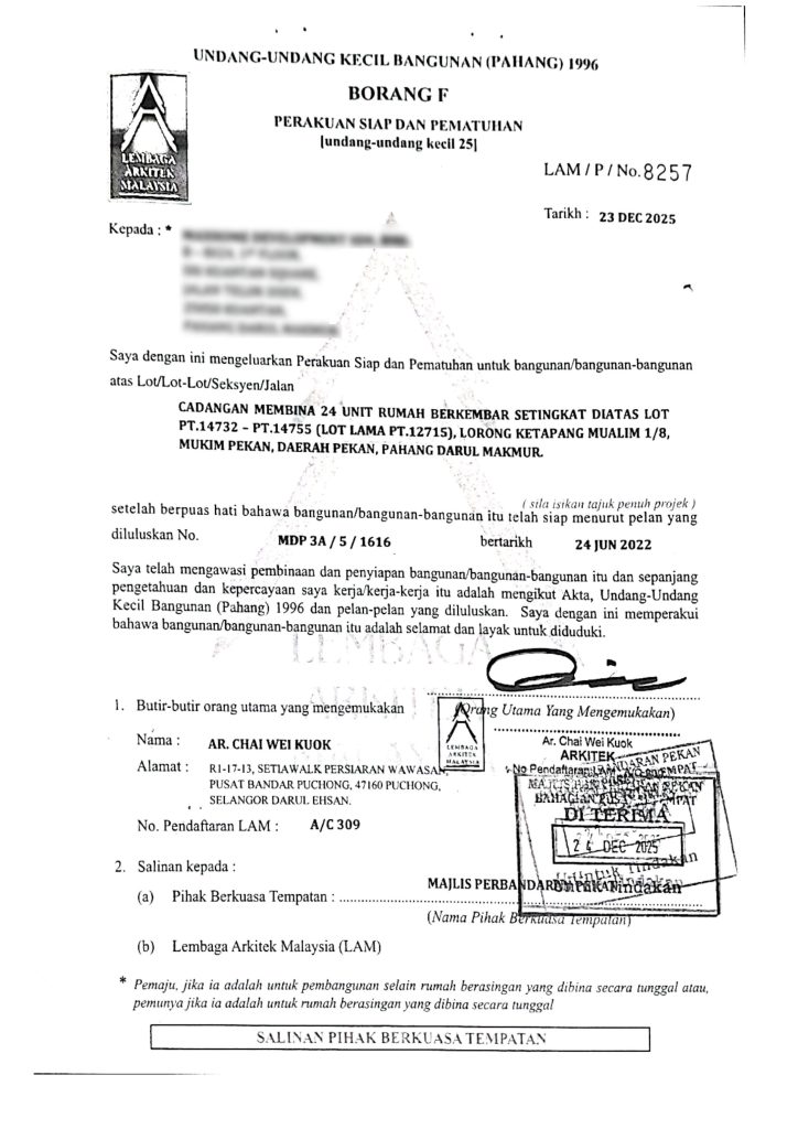 We are pleased to announce that we have obtained Certificate of Completion and Compliance (CCC) for our project Taman Bayu Permai (Ketapang, Pekan, Pahang) dated 23/12/2025 We would like to take this opportunity to express our sincere gratitude and appreciation to all related parties for their hard work and commitment given toward a successful project.